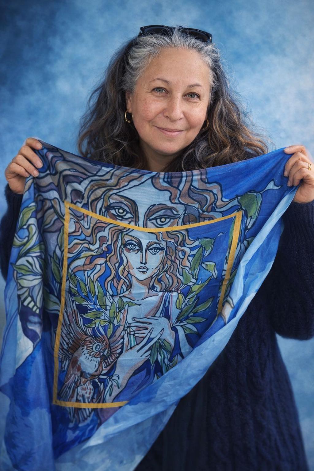 Этот платок — визуальное путешествие в современную Грецию, где древние символы обретают новое художественное звучание.