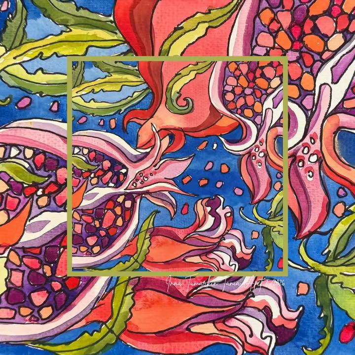В центре композиции — гранат, один из самых мощных образов средиземноморской культуры. Он символизирует изобилие, любовь, женскую силу, жизненную энергию и непрерывность жизни. Здесь гранат не изображён буквально — он переосмыслен через авторскую акварельную иллюстрацию, сложную цветовую драматургию и живую, ручную линию.