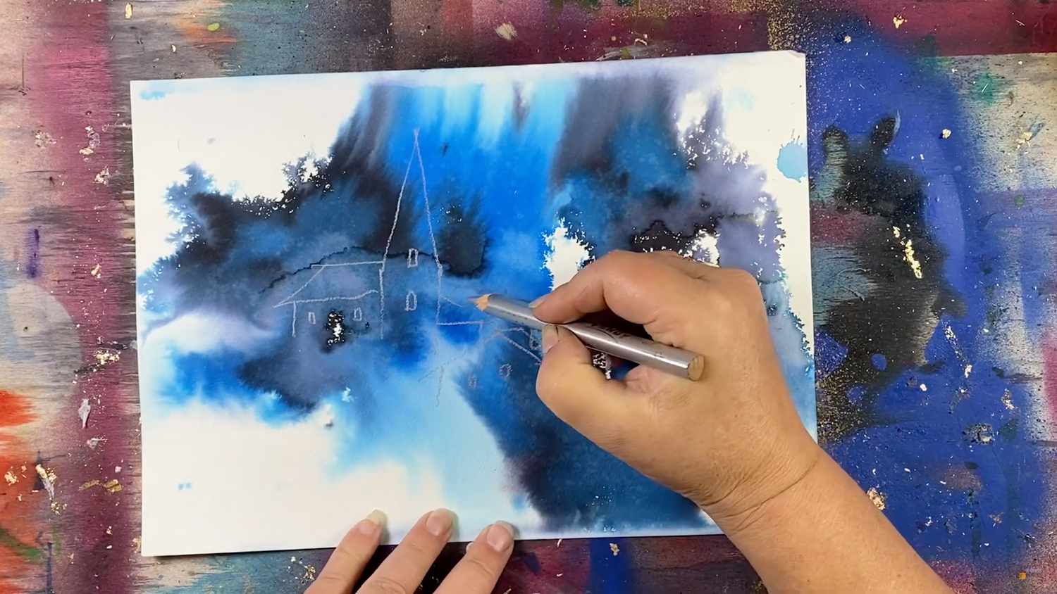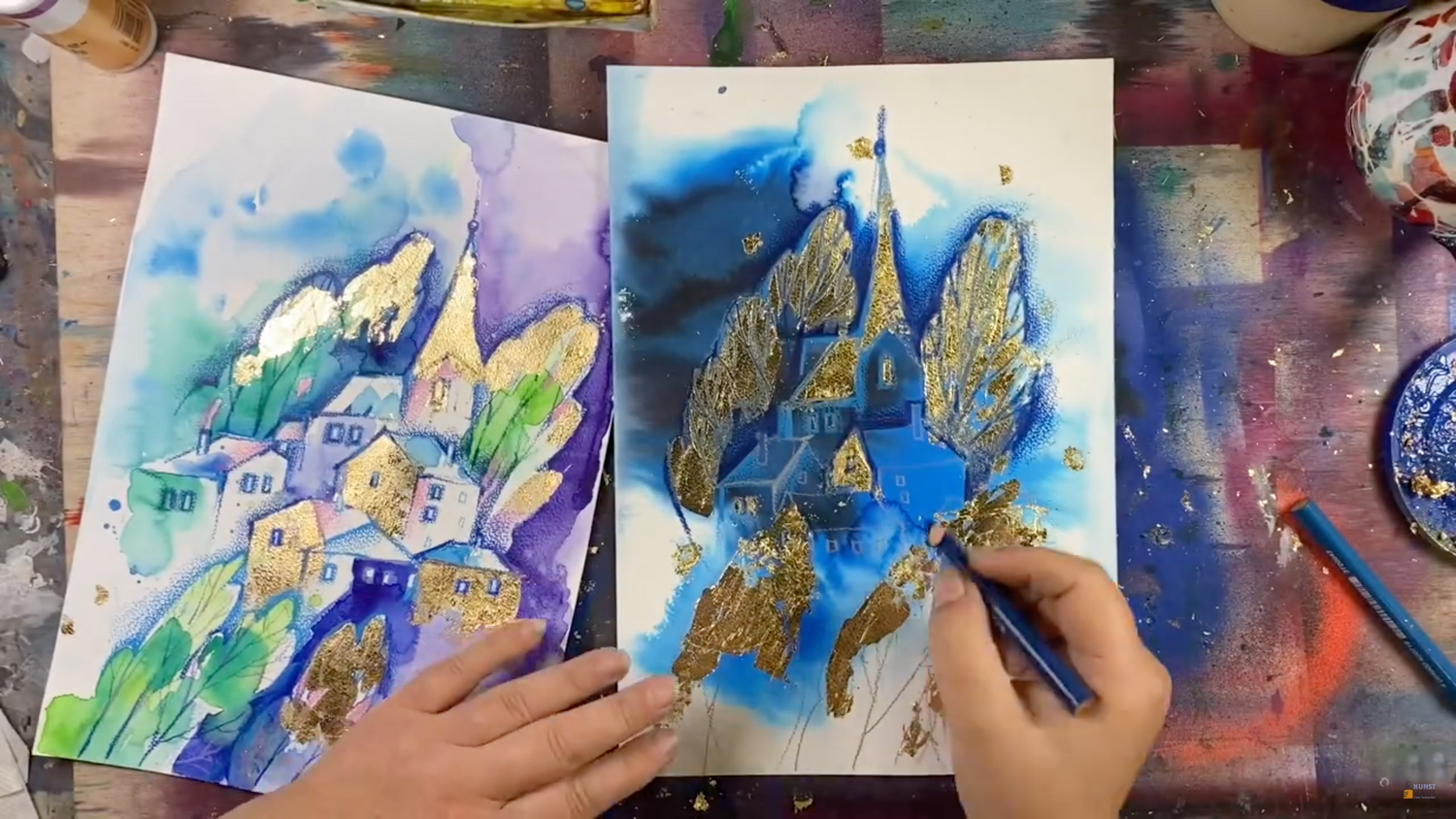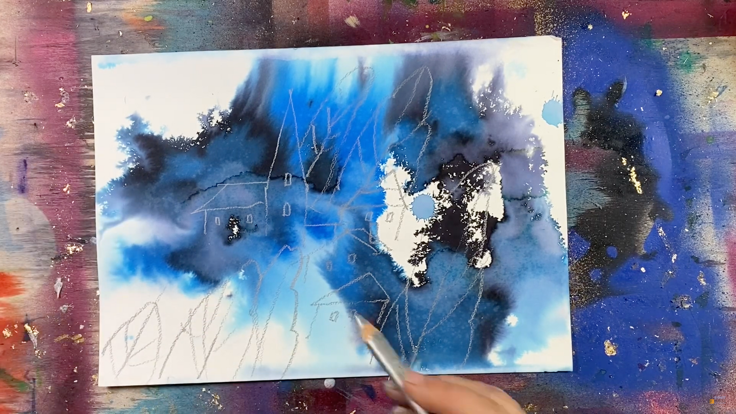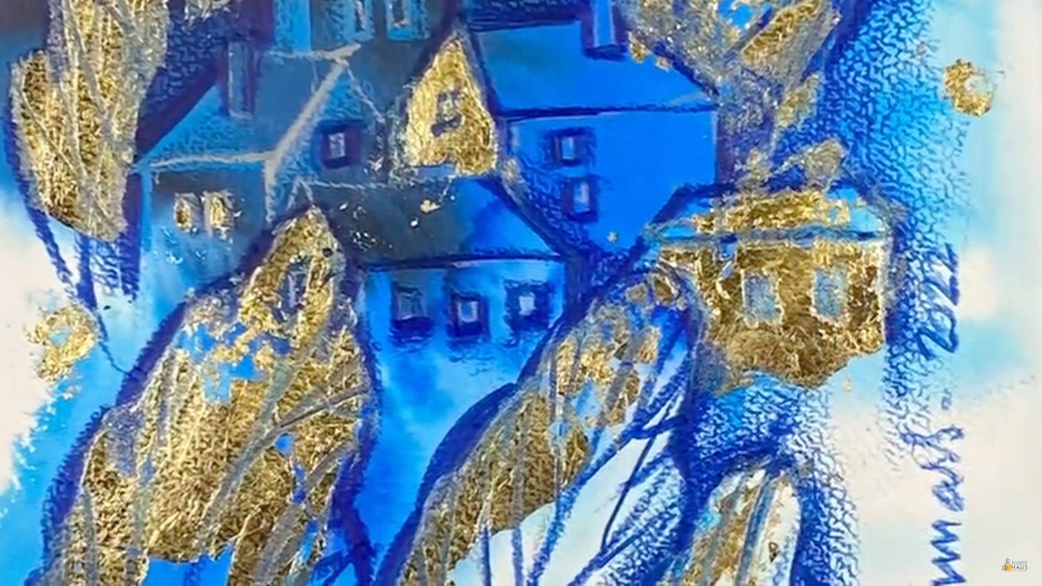 Голубой пейзаж с ветром — изобразим то, что невозможно потрогать и попробовать - легкий ветерок в австрийской деревне. Для того, чтобы передать эту атмосферу, используем золотую поталь, и ограниченную палитру синих и темно-голубых цветов. Для изображения графического рисунка будем использовать серебряный карандаш.