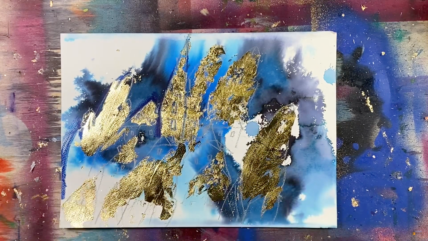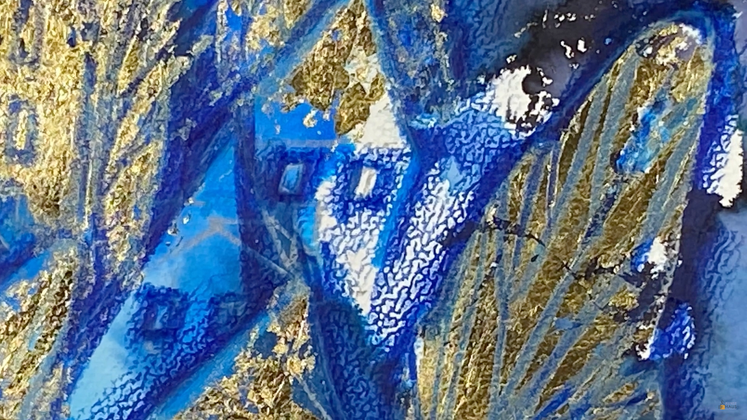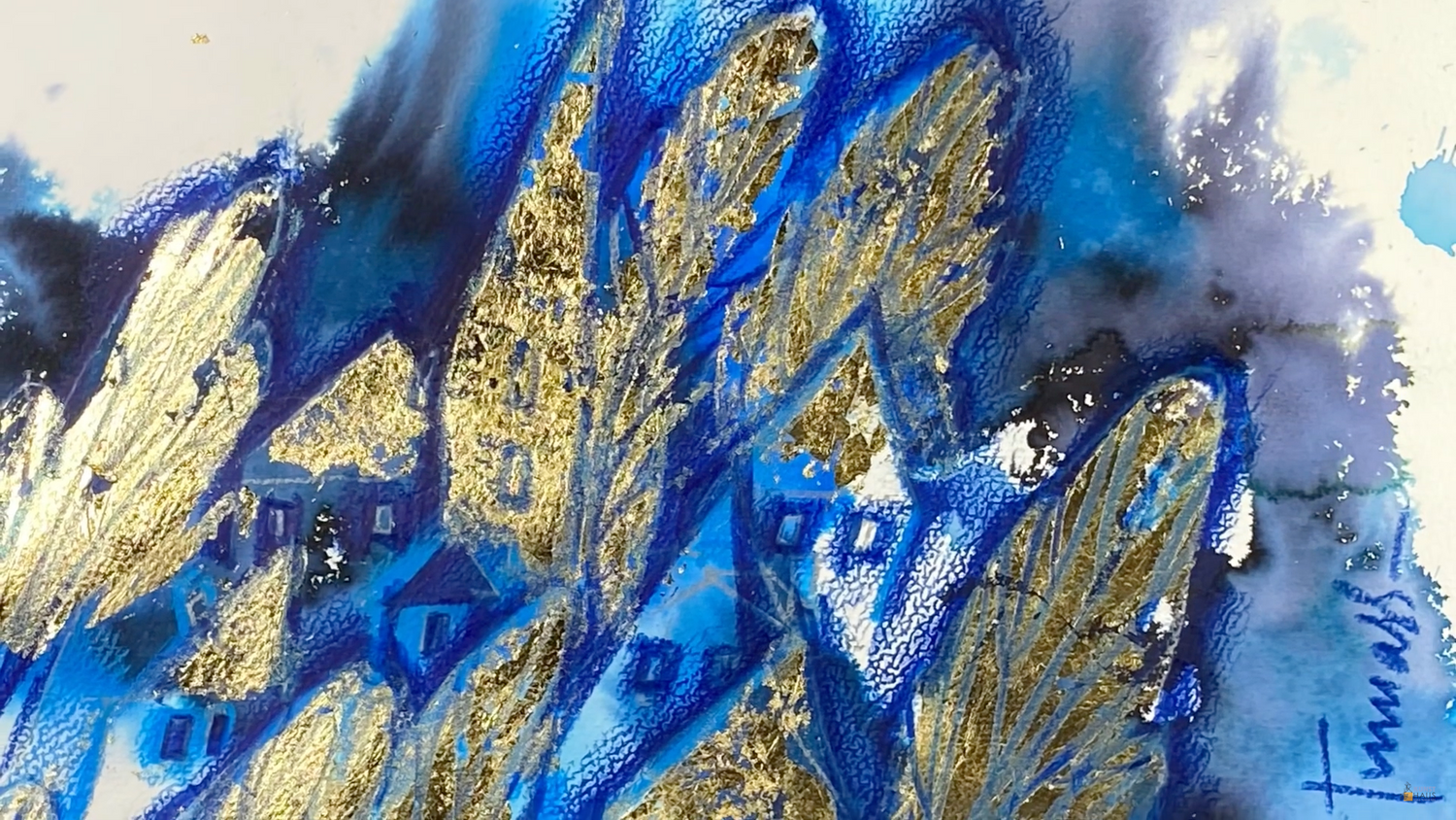 Для выразительности расположим золотые листы в продуманных частях рисунка, а также оставим хаотичные вкрапления золотых деталей вокруг композиции. Делать это нужно с чувством меры и гармонии. Смотрите видео, вы узнаете, как придерживаться равновесия в своей работе, чтобы золото смотрелось уместно, изысканно и выгодно контрастировало на синем фоне.