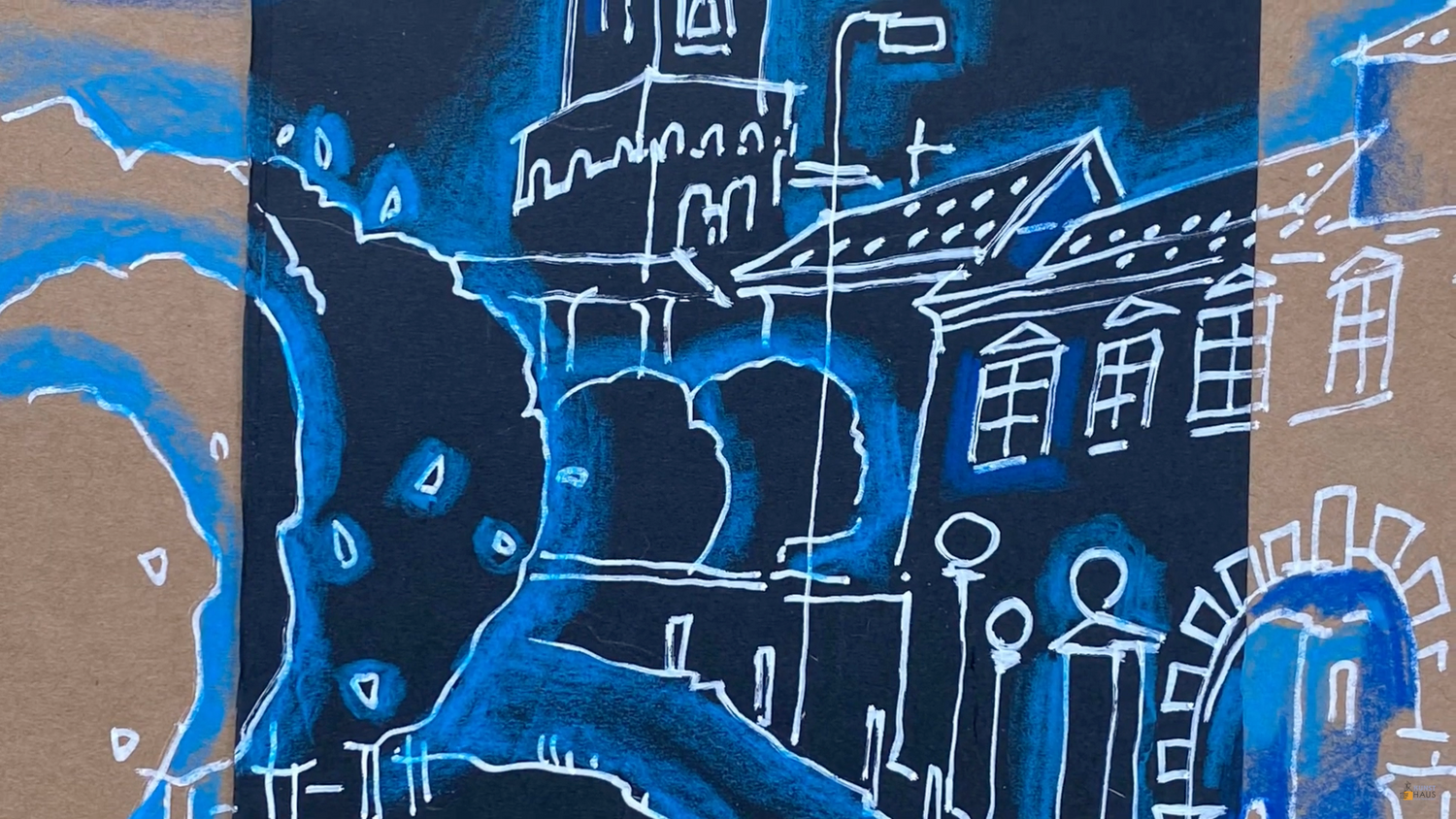 Сделаем простой, на первый взгляд, сюжет, но дальнейшие действия для выделения деталей помогут добавить выразительности — соберем композицию шотированием с помощью голубого и синего карандашей.