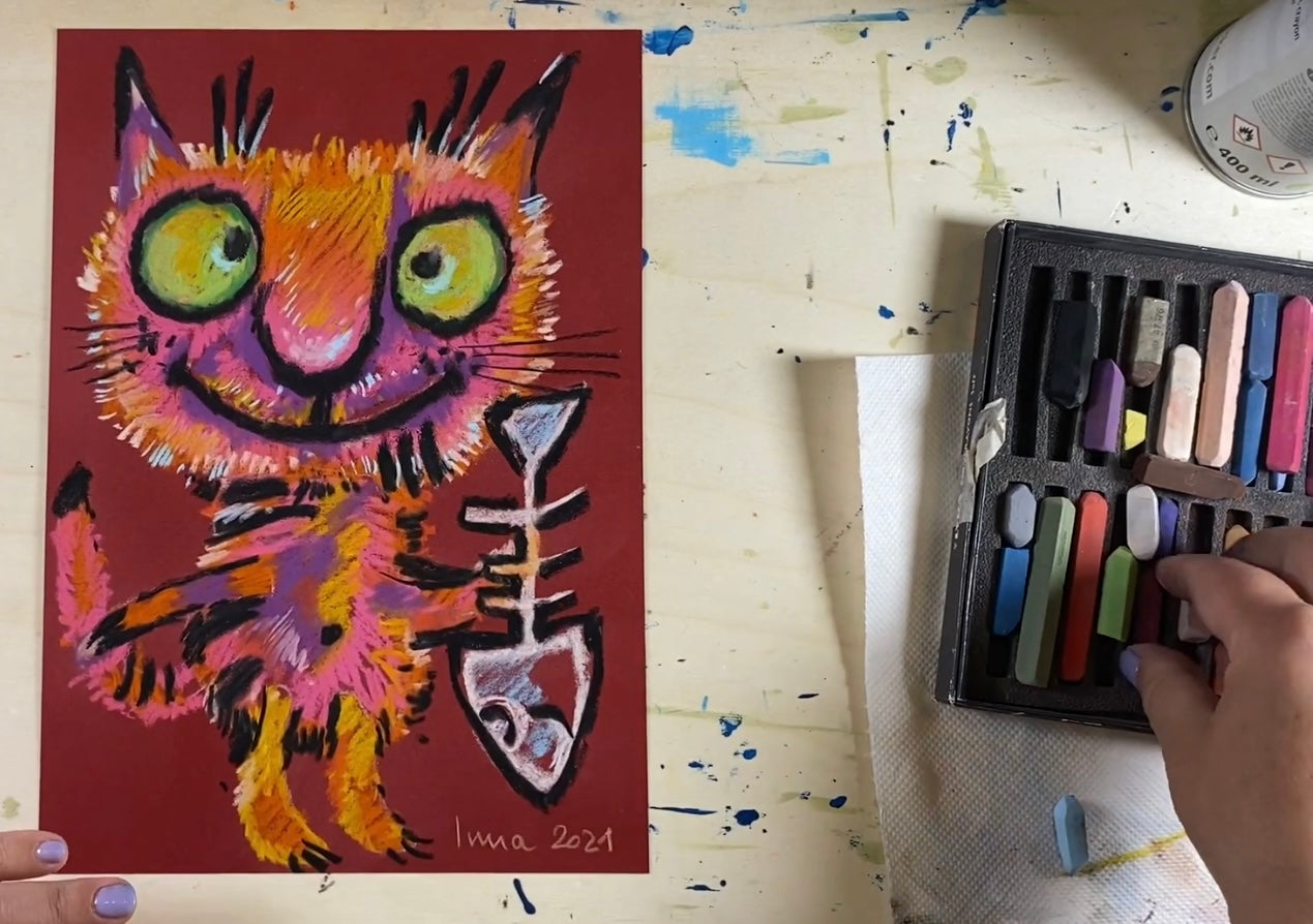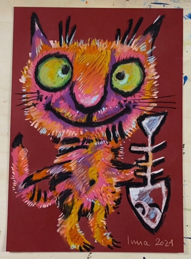 Красный кот с любимой рыбой. Сухая пастель