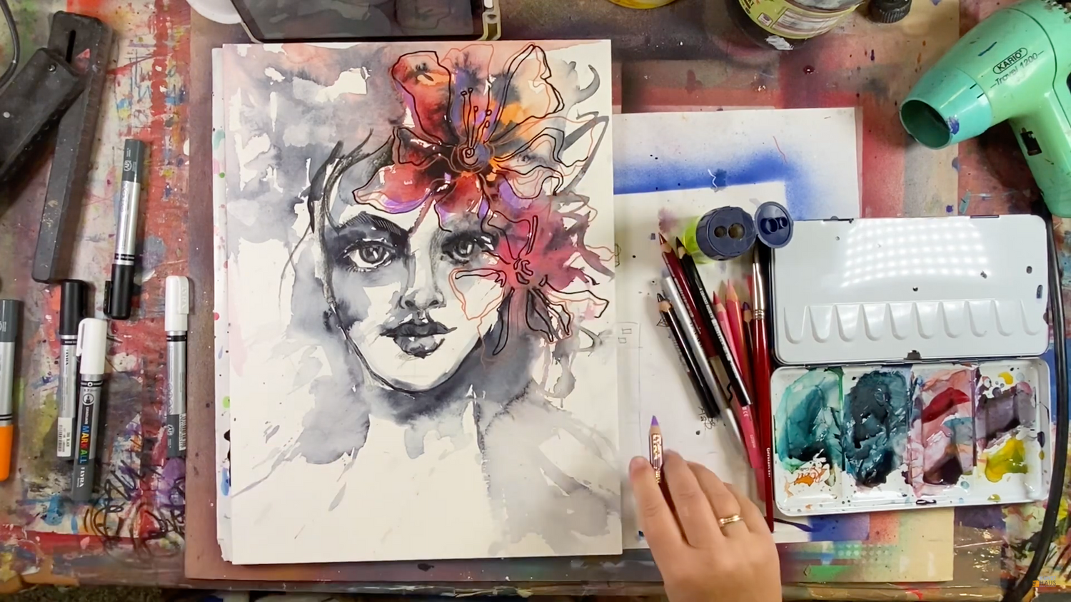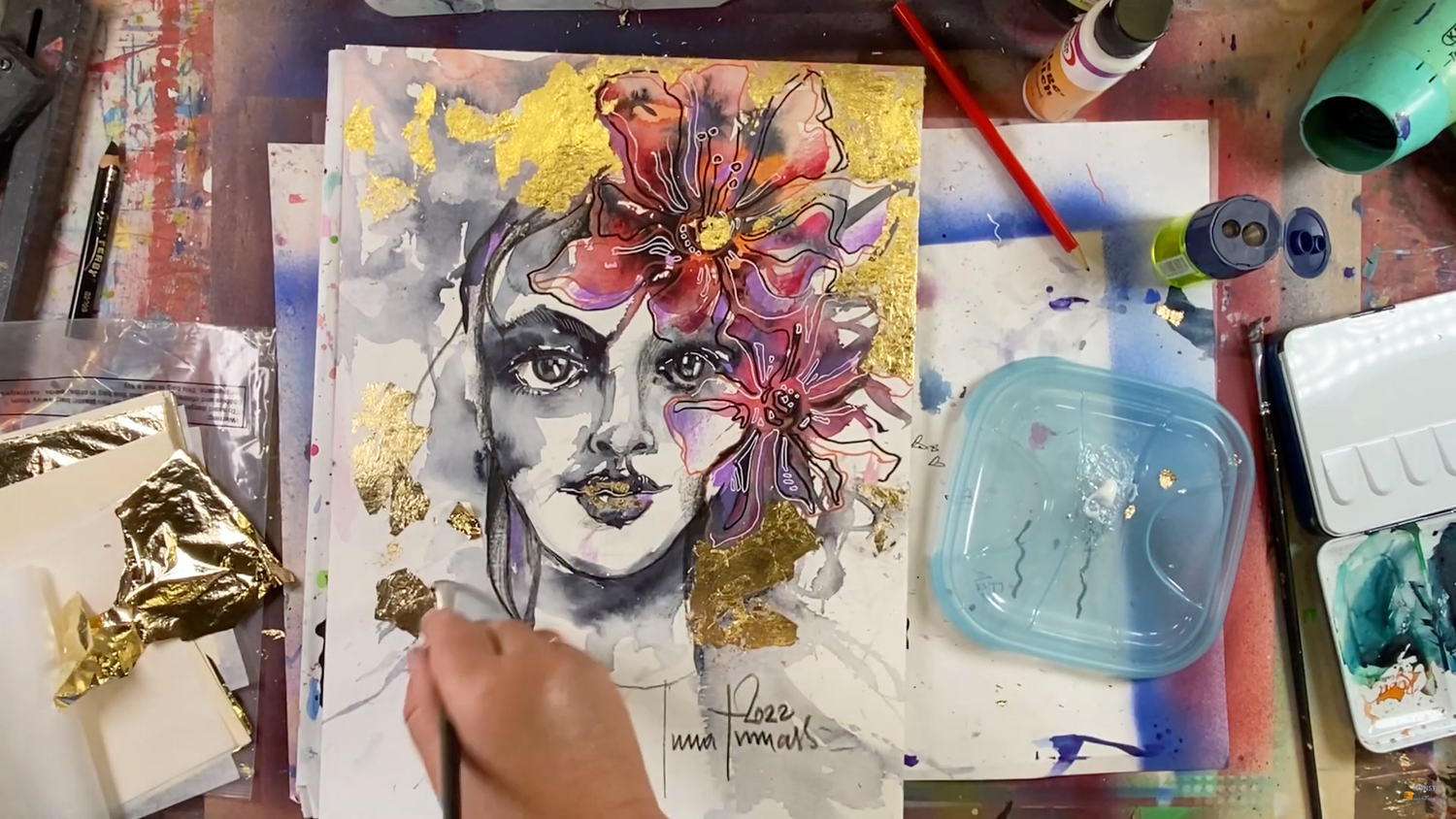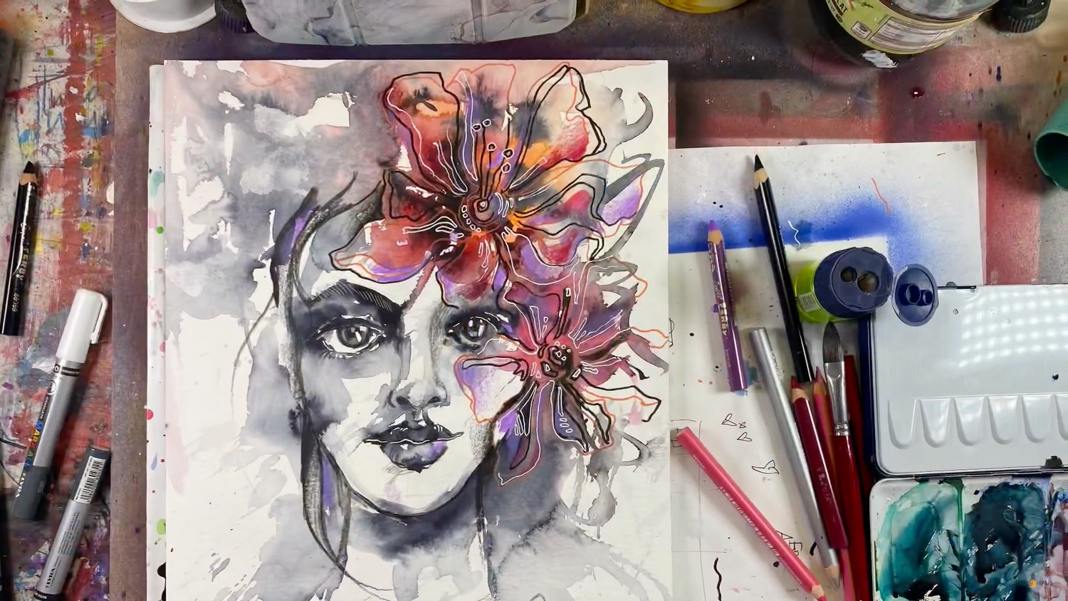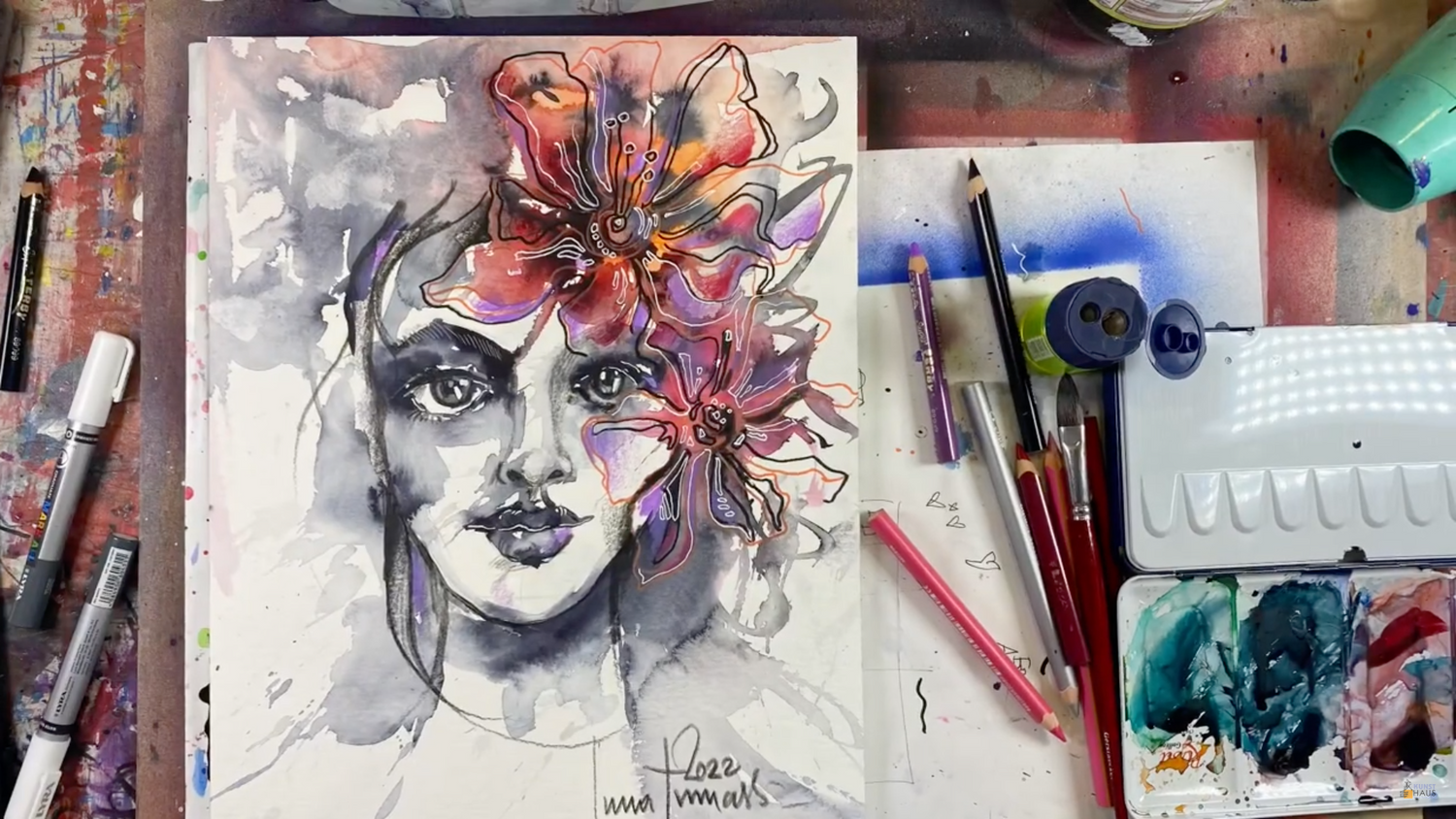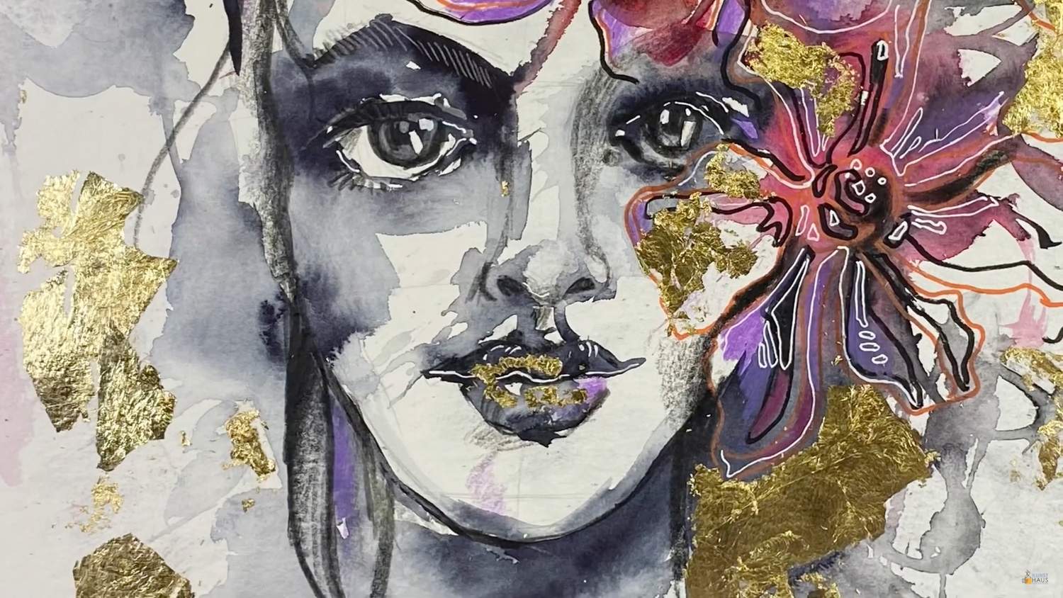 🍒 В уроке вы узнаете, как сделать две стадии креативного портрета — в технике акваграфика, с применением карандашей и маркеров, а также можете дополнить работу золотыми деталями.