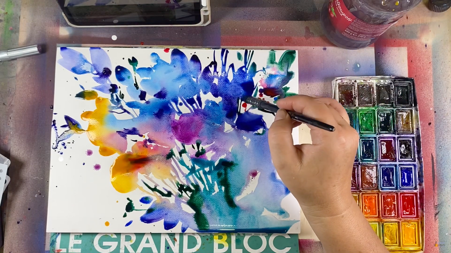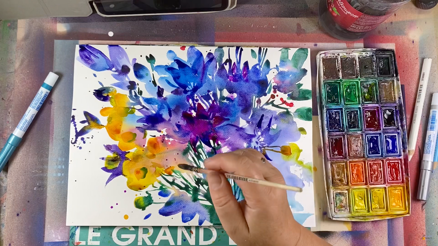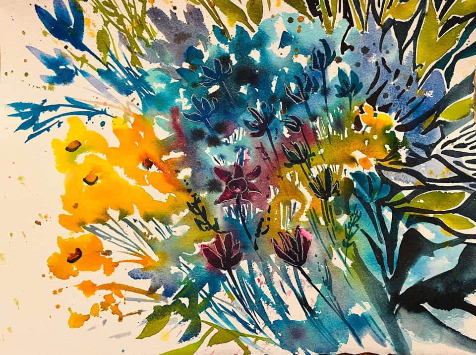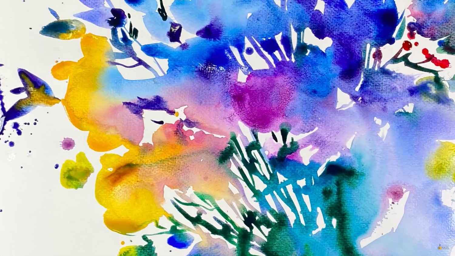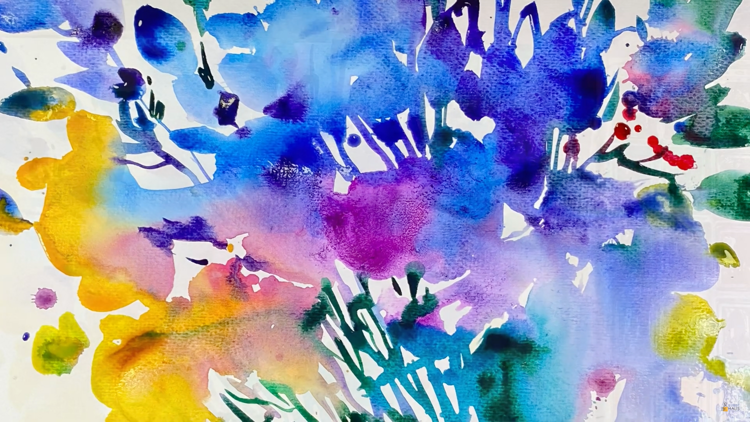 Вы узнаете, до какой степени высыхания пятна необходимо довести акварель, чтобы снова продолжить рисовать на полу-сухой поверхности. Таким образом, сохранится эффект "сфумато" и на композиции можно будет увидеть первые очертания силуэтов полевых цветов.
