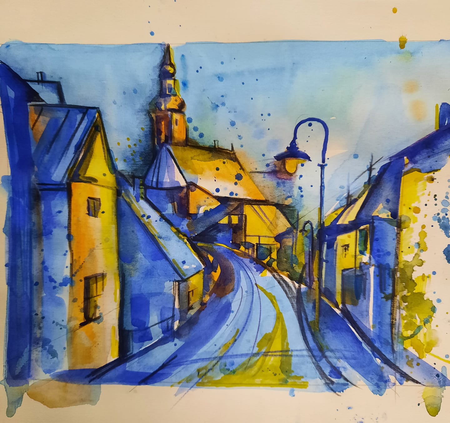 Начните с базовых этапов: выбор референса, построение перспективы, создание акварельного фона, завершение работы с выделением акцентов цветными карандашами.