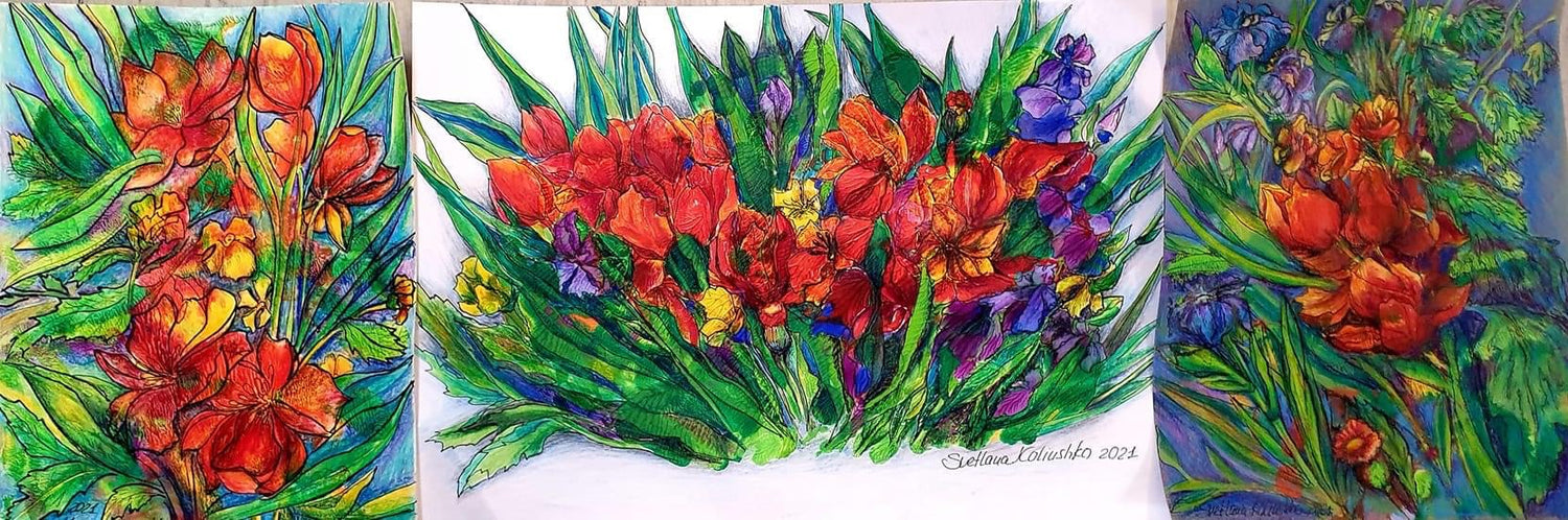 "Подоспели мои цветочки. Инночка, очень заражает твоя затея-рисовать пространство и соотношения. Сегодня увидела одну очень яркую фотографию в интернете, хочу попробовать с твоим же подходом нарисовать по этой фотографии."