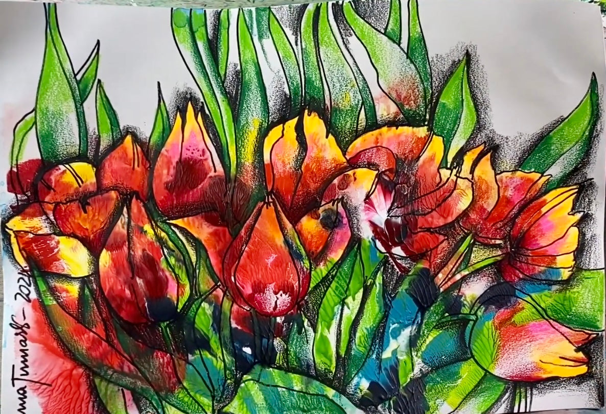 Очень интересная творческая техника с богатыми возможностями, комбинированная с графической доработкой. Довольно несложная , но эффектная работа